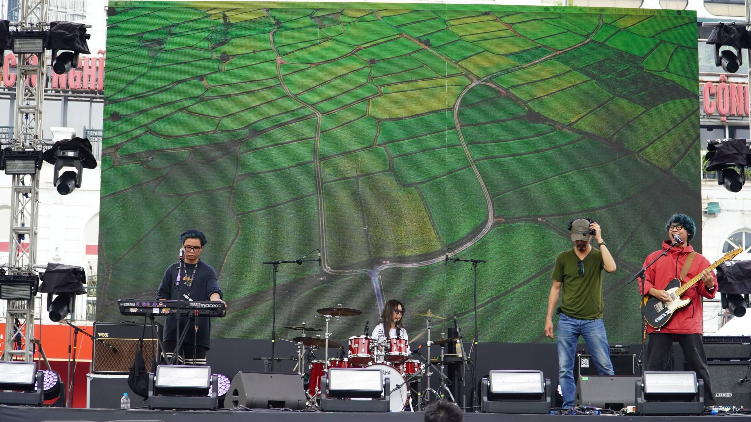 Các nghệ sĩ đang gấp rút soundcheck, tập duyệt cho đêm khai hội, mở màn tuần lễ "Phố Hàng Nhạc" của Lễ hội âm nhạc Quốc tế Gió Mùa (Monsoon Music Festival) 2023.