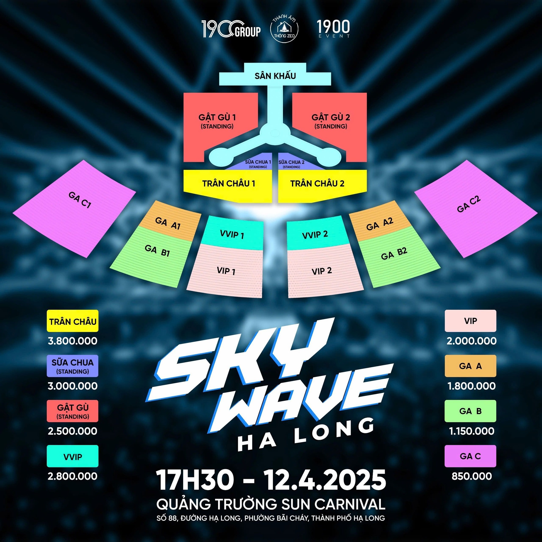 Ngoài ra, sơ đồ sự kiện cũng được Ban tổ chức công bố. Theo đó, mức giá vé của sự kiện dao động từ 850.000 đồng đến 3.800.000 đồng bao gồm: GA C (850.000 đồng), GA B (1.150.000 đồng), GA A (1.800.000 đồng), VIP (2.000.000 đồng), VVIP( 2.800.000 đồng), Gật Gù (standing – 2.500.000 đồng), Sữa Chua (standing – 3.000.000 đồng) và Trân Châu (3.800.000 đồng). SKYWAVE