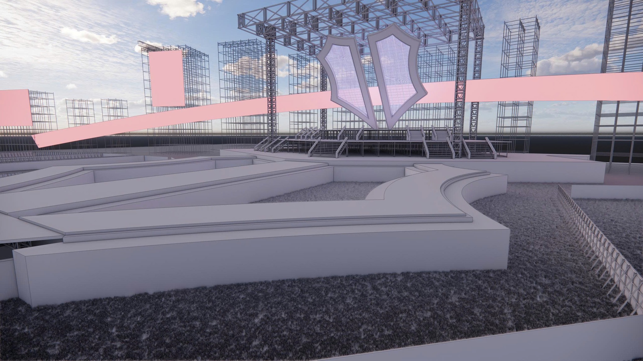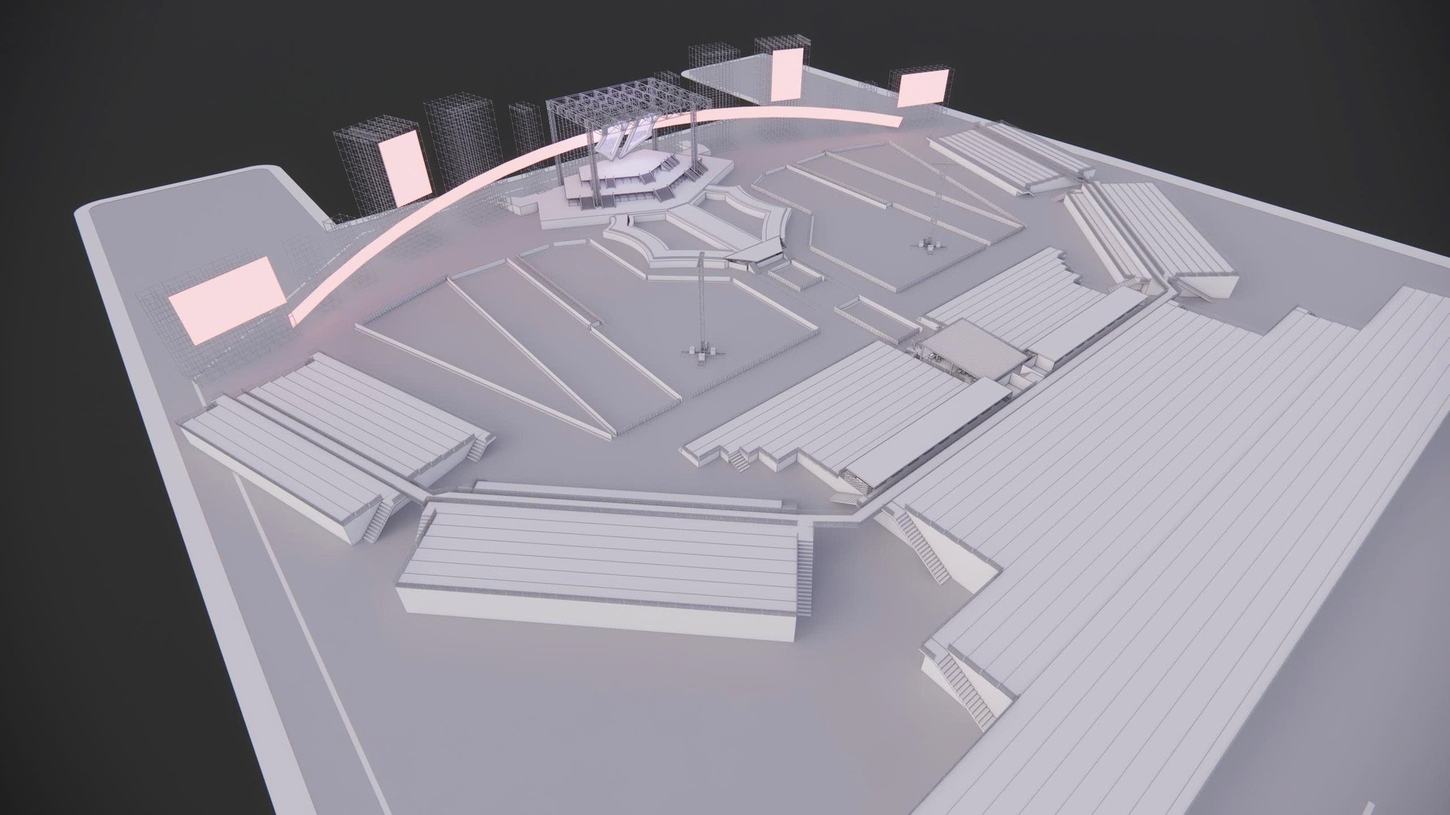 Điểm nhấn nổi bật chính là màn hình LED cong khổng lồ dài gần 200m bao trọn tầm nhìn, tạo nên hiệu ứng thị giác ấn tượng. Toàn bộ hệ thống được dựng trên khung giàn steel truss chuẩn show quốc tế, có khả năng chịu tải lên tới 100 tấn.
