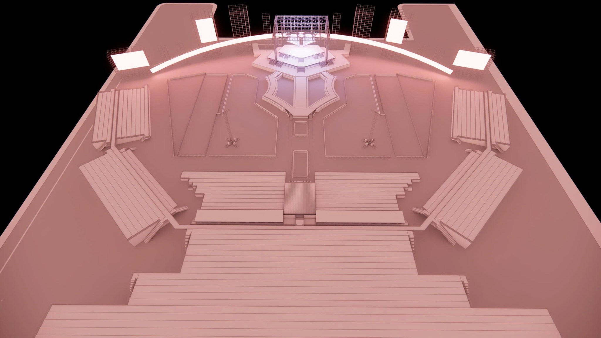 Sàn sân khấu chính được thiết kế kết cấu 3 tầng, cao hơn 6m, tạo chiều sâu và sự linh hoạt cho các tiết mục. Không gian này sẽ mở ra nhiều lớp diễn, biến mỗi khoảnh khắc trình diễn thành một bức tranh sống động.