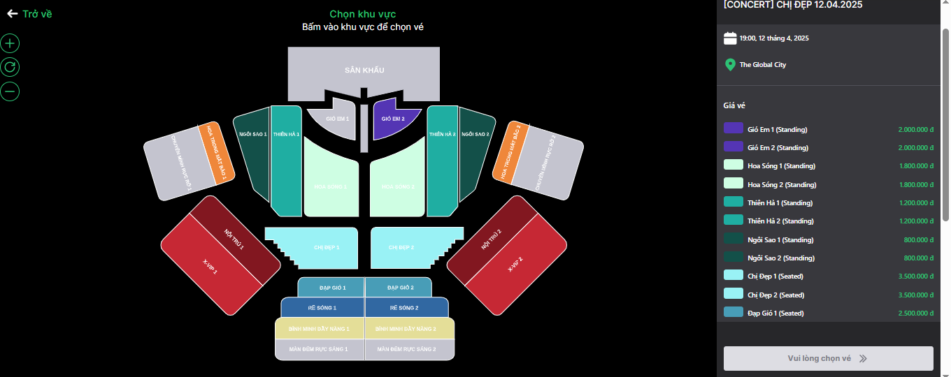 Tính đến sáng nay 12/3, 4 hạng vé có mức giá thấp nhất (800.000 đồng) cùng 1 hạng vé Gió Em 1 (Standing). Ê-kíp sản xuất chưa công bố con số cụ thể nhưng theo thông tin trên trang web bán vé chính thức, phần lớn hạng vé trong sơ đồ chưa bán hết. Ngay cả những hạng vé có mức giá thấp nhất như Ngôi sao (800.000 đồng) hay Thiên hà (1,2 triệu đồng) cũng chưa hết.