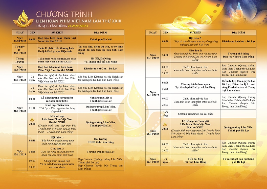 Nhiều hoạt động sẽ diễn ra trong dịp này như: Tuần phim “Chào mừng Liên hoan Phim Việt Nam lần thứ XXIII” với một số phim truyện tham dự Liên hoan sẽ được chiếu tại các cụm rạp ở 3 thành phố: Hà Nội, Đà Lạt, Tp.Hồ Chí Minh; phát sóng một số bộ phim truyện điện ảnh Việt Nam, phim tài liệu, phim hoạt hình đã từng được giải thưởng cao trong các kỳ LHP Việt Nam trước đây trên VTV. Trong khuôn khổ liên hoan phim sẽ diễn ra 2 hội thảo: “Bảo hộ bản quyền trong phát triển công nghiệp điện ảnh” do Cục Bản quyền tác giả, Bộ VH-TT&DL chủ trì, tổ chức vào sáng 22/11 tại Hội trường UBND Tp.Đà Lạt; hội thảo “Một số vấn đề trọng tâm trong xây dựng công nghiệp điện ảnh Việt Nam” do Cục Điện ảnh, Bộ VH-TT&DL chủ trì, tổ chức vào sáng 23/11 tại khách sạn Sài Gòn – Đà Lạt.