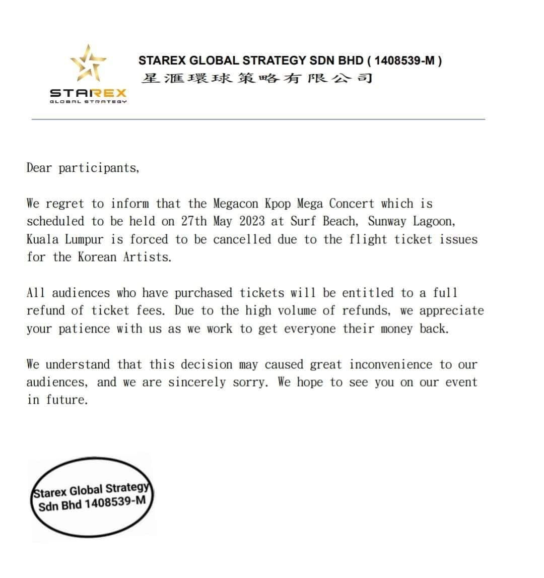 Ngay sau đó, Megacon Kpop Mega Concert được dời lịch tổ chức vào thứ Bảy (ngày 27 tháng 5 năm 2023) – hứa hẹn sẽ quy tụ các nghệ sĩ Hàn Quốc như Super Junior, Viviz và Teen Top, ca sĩ Ribbon Ooi (黄若熙) và DJ Noize Faktor, tiếp tục bị hủy bỏ trước ngày chính thức diễn ra vào đêm 25/05/2023.