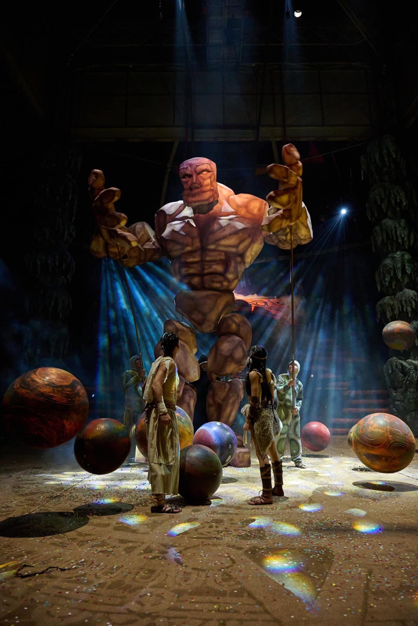 Tổng thể bối cảnh kết hợp từ đạo cụ, ánh sáng đến thiết kế sân khấu chính là điều tráng lệ nhất về vở xiếc Vùng Đất Kỳ Bí. Mặt sân khấu được làm mới, có hoa văn gợi nhớ đến trống đồng. Rạp sử dụng công nghệ ánh sáng 3D tân tiến, thay vì đèn mặt chiếu trực tiếp và đơn điệu như đa số vẫn nghĩ, tạo nên 5 chương hồi có sắc màu riêng biệt, mãn nhãn. Trong đó, Thần Thổ khổng lồ cao khoảng 6m xuất hiện với màn tung hứng bóng khiến người xem thích thú.