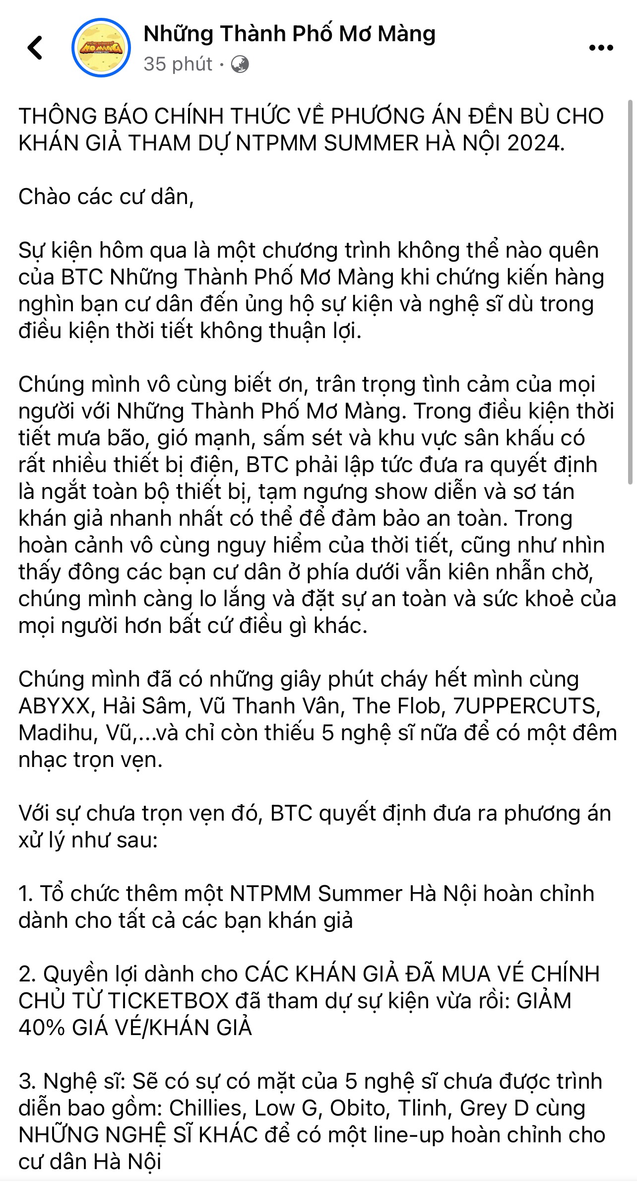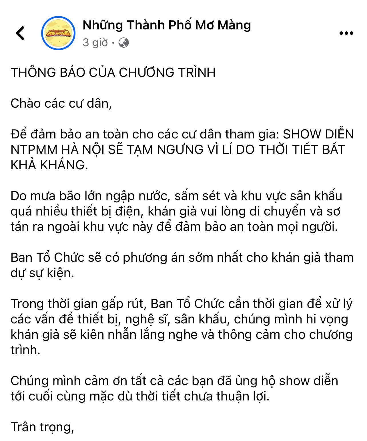 Đêm nhạc Những Thành Phố Mơ Màng Summer Tour tại Hà Nội đã không được diễn ra theo đúng kế hoạch do mưa giông. Để giải quyết vấn đề này, ban tổ chức của chương trình đã đưa ra thông báo chính thức.