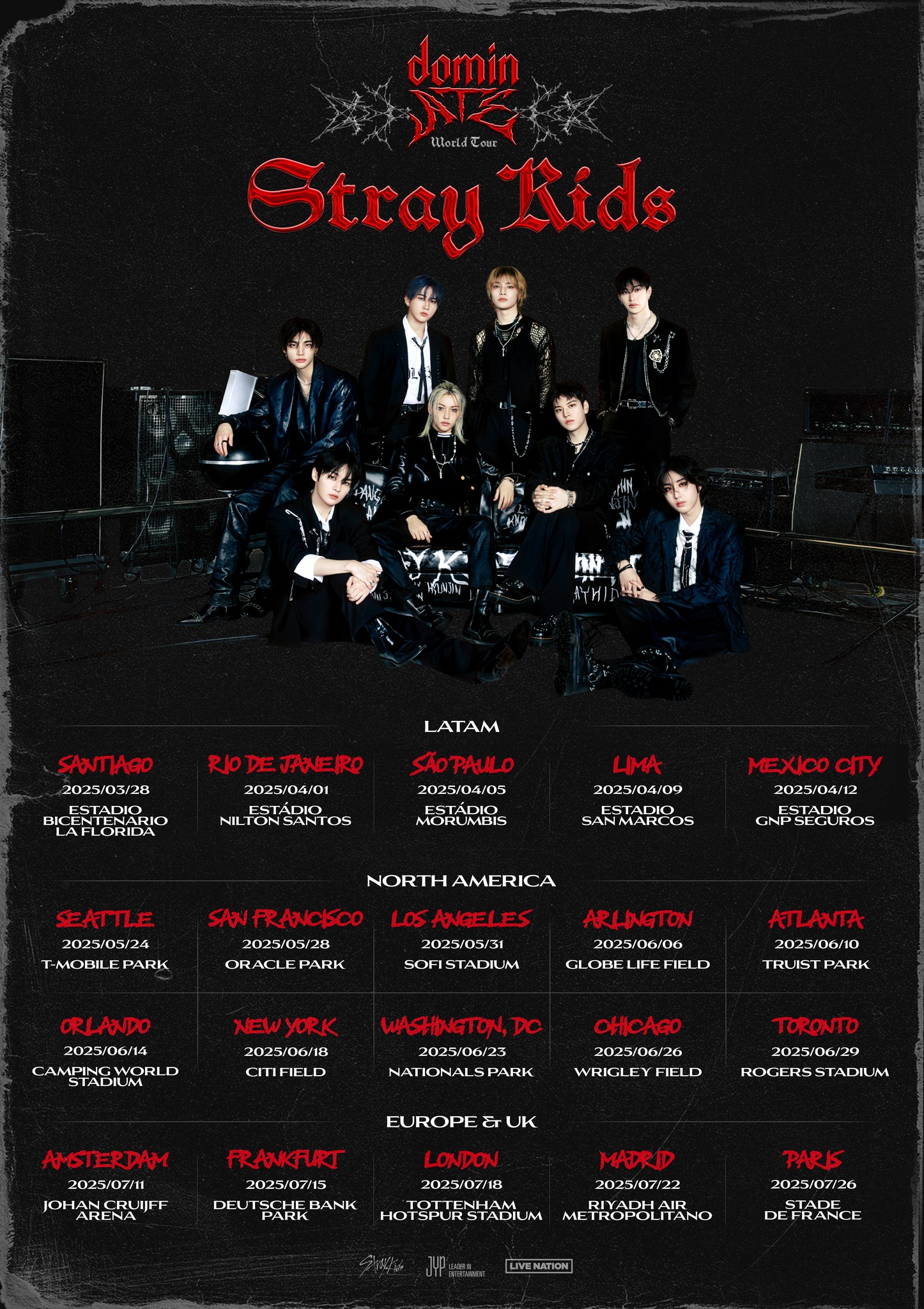 Nhóm nhạc Stray Kids đã tung poster công bố thêm một số điểm dừng chân tại chặng Bắc Mỹ cho chuyến lưu diễn vòng quanh thế giới 2024-2025 của mình, thu hút sự quan tâm lớn từ người hâm mộ toàn cầu.