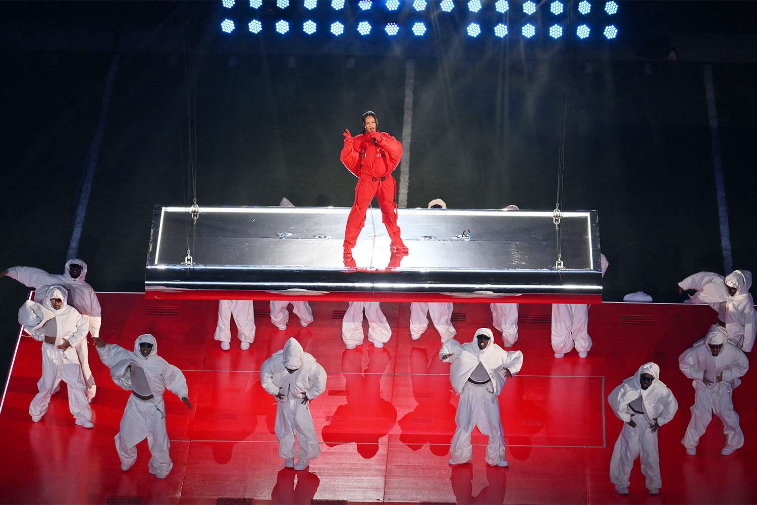 Cuối cùng, không thể không nhắc tới nữ ca sĩ có màn trình diễn được đánh giá có thể nằm trong những màn solo hay nhất trong lịch sử biểu diễn giữa hiệp Super Bowl – Rihanna. Tại Super Bowl Halftime Show 2023, Rihanna đã xuất hiện trên sân khấu lơ lửng giữa không trung cùng bộ đồ “tone-sur-tone” đỏ chót hút mắt khán giả. Xuyên suốt màn trình diễn, hiệu ứng ánh sáng, cách sân khấu di chuyển lên xuống, thay đổi luân phiên ứng với từng bài hit Rihanna thể hiện cùng dàn vũ công trong bộ đồ trắng tạo hiệu ứng thị giác đẹp mắt ở từng góc nhìn. Sân khấu trong năm 2023 cũng được đầu tư sơn phản quang đỏ để kết hợp với hiệu ứng ánh sáng làm nổi bật tổng thể cả màn trình diễn.