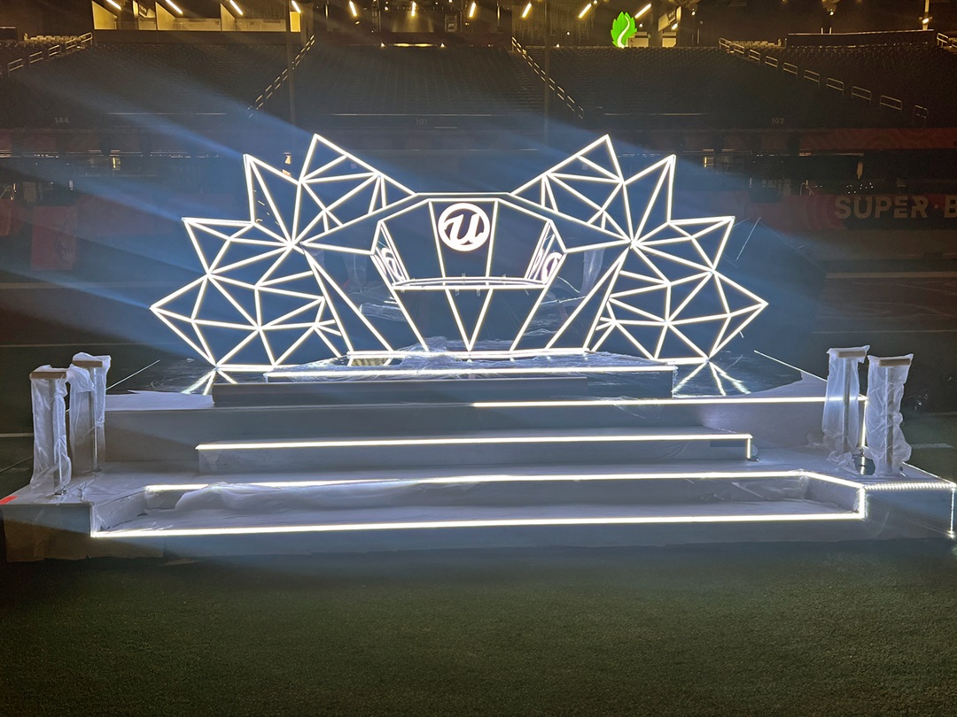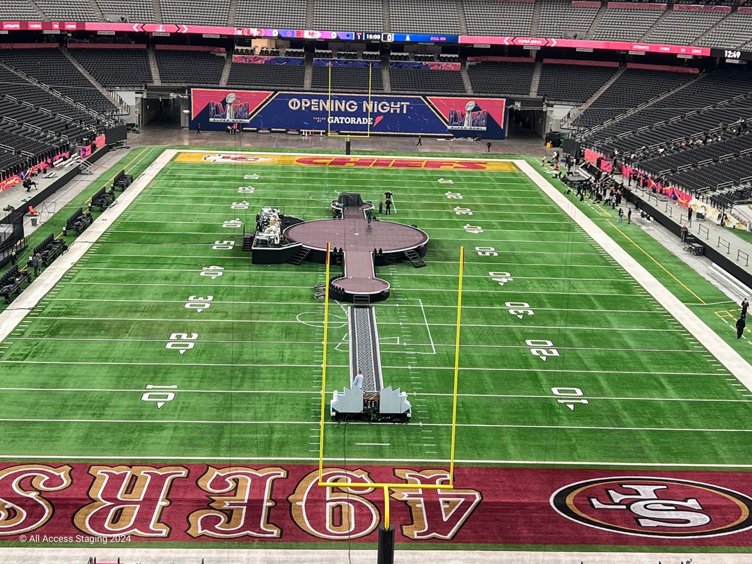 Như mọi khi, hệ thống sân khấu sử dụng là Versa, được phát triển đặc biệt cho các buổi biểu diễn giữa hiệp. Nó sử dụng cấu trúc hỗ trợ tải trọng lớn cùng lốp khí nén, được thiết kế để lăn trên các khu vực nhạy cảm mà không ảnh hưởng đến sân cỏ.