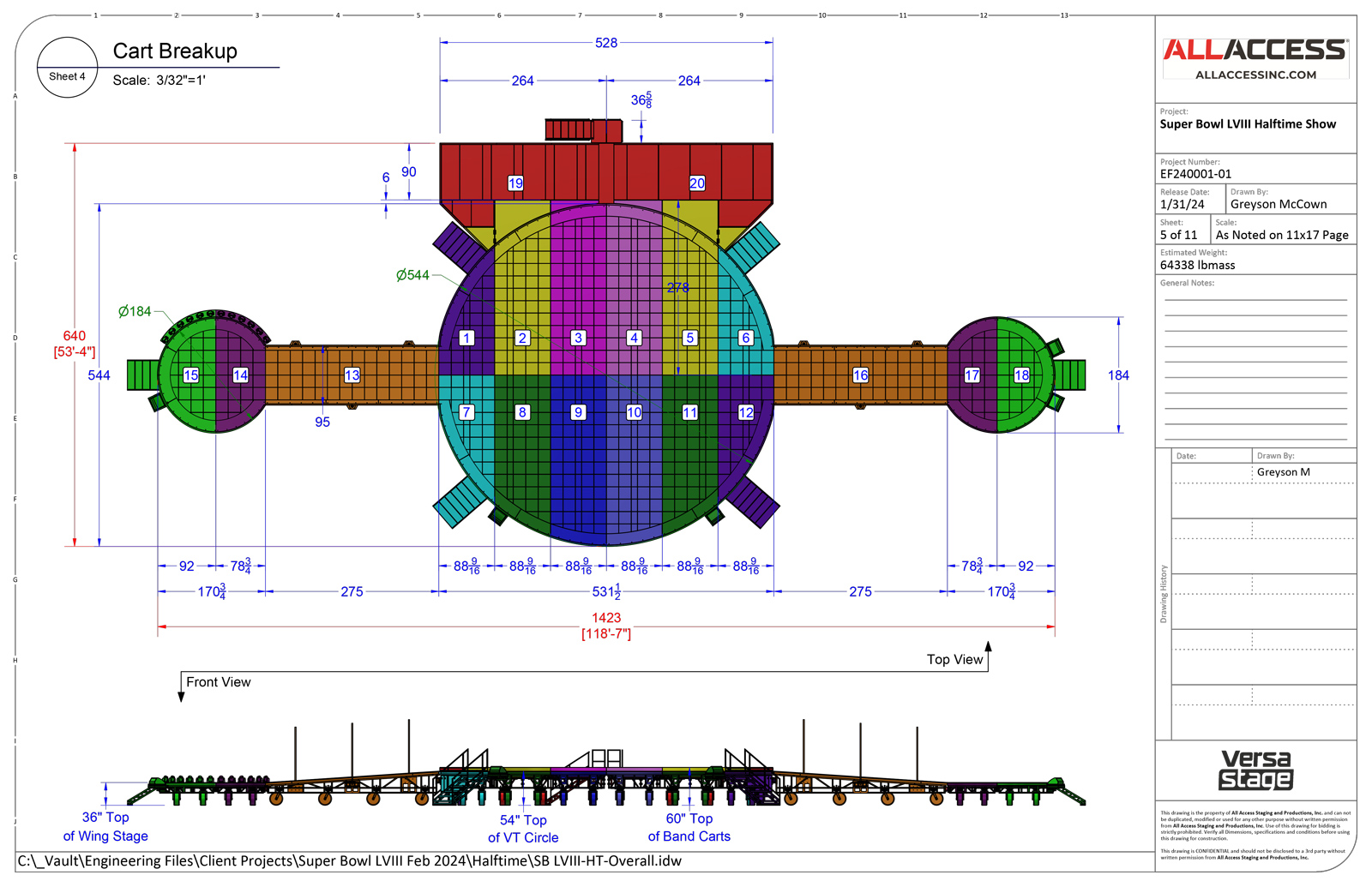 Điều cần cân nhắc chính trong mỗi buổi biểu diễn giữa hiệp là vận chuyển xe (mà bên trên là bề mặt sân khấu) một cách an toàn và hiệu quả qua hành lang sân vận động và lên trung tâm sân đấu chính. Năm nay, đội ngũ sản xuất đã bổ sung thêm mở rộng cho đoạn đường hành lang nối tới sân vận động để phù hợp với chiều rộng của xe đẩy và đoàn người vận hành trực tiếp đẩy và di chuyển. Ngoài ra, nhóm cũng đã giải quyết vấn đề chuyển đổi đột ngột của đoạn đường nối bằng cách sửa đổi độ dốc vào sân vận động, đảm bảo xe di chuyển trơn tru và nhanh chóng trong khi vẫn duy trì các tiêu chuẩn an toàn (cụ thể là không ảnh hưởng tới cỏ, không gây lún mặt đất cả trong và ngoài sân đấu).