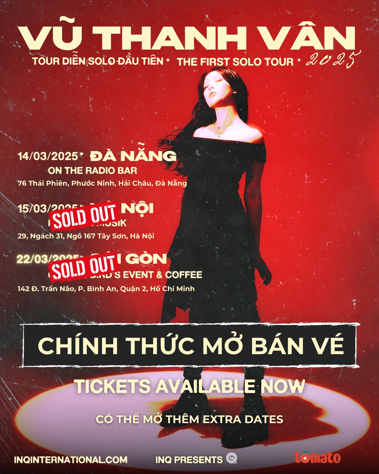 Vũ Thanh Vân vừa công bố tour diễn solo đầu tiên trong sự nghiệp mang tên The First Solo Tour 2025. Chuỗi đêm diễn sẽ diễn ra tại ba thành phố lớn, bắt đầu từ Đà Nẵng vào ngày 14/03, tiếp đến là Hà Nội vào ngày 15/03 và kết thúc tại Sài Gòn vào ngày 22/03.